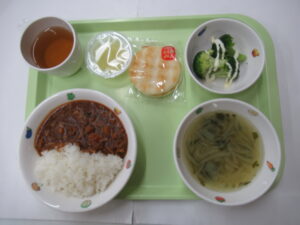 12月3日(水) 給食:ハヤシライス・ブロッコリーのマヨドレ・スープ   おやつ:みかんゼリー・せんべい