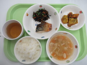 4月3日(木)給食:魚のこうじ焼き・ひじきの煮物・みそ汁      おやつ:大学芋New!!