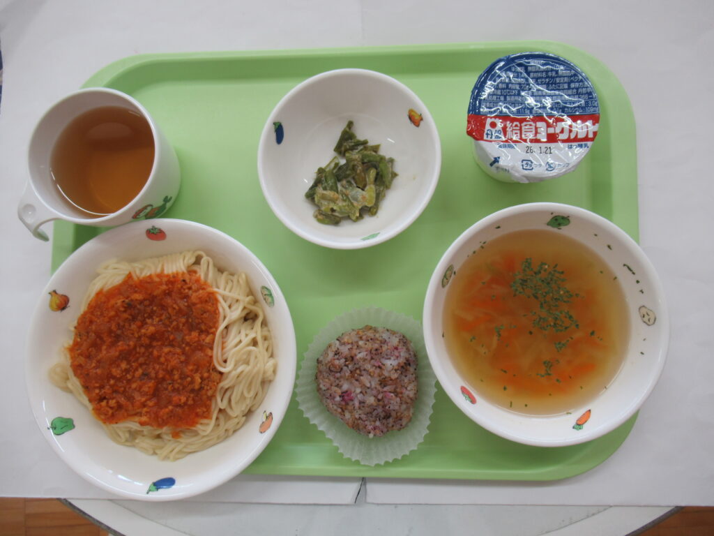2026年1月13日 / 最終更新日時 : 2026年1月13日 shiinoki-hoikuen 給食 1月13日(月)給食:ミートスパゲティー・茹でいんげん・スープ・ヨーグルト おやつ:ゆかりおにぎり