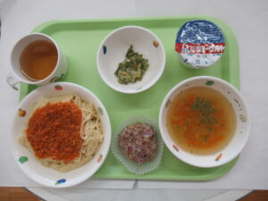 1月13日(月)給食:ミートスパゲティー・茹でいんげん・スープ・ヨーグルト  おやつ:ゆかりおにぎりNew!!