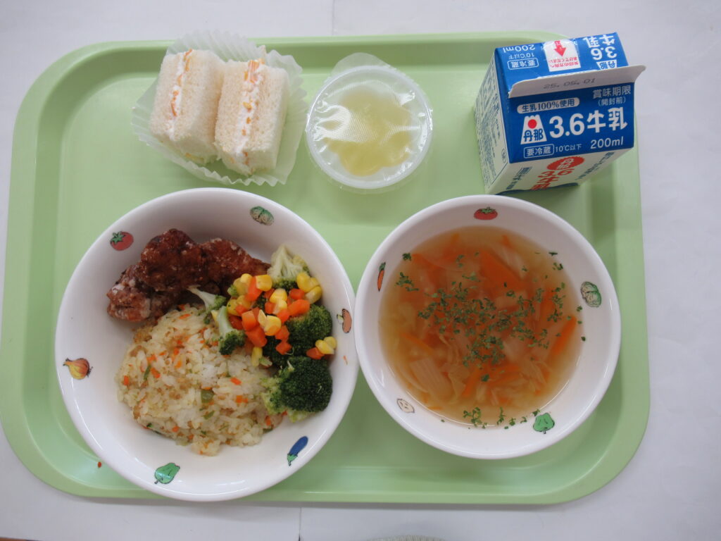 2026年1月14日 / 最終更新日時 : 2026年1月14日 shiinoki-hoikuen 給食 1月14日(水)給食:カレーチャーハン・フライドチキン・彩りブロッコリー・スープ・ゼリー おやつ:デコフルーツサンド