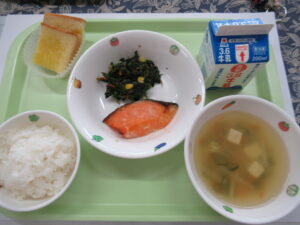 1月15日(木)給食:魚のこうじ焼き・ほうれん草のおかか和え・みそ汁 おやつ:シュガートースト・牛乳New!!