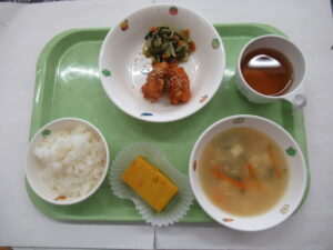 1月16日(金)給食:ヤンニョムチキン・もやしの中華和え・みそ汁  おやつ:もちもちかぼちゃのケーキNew!!