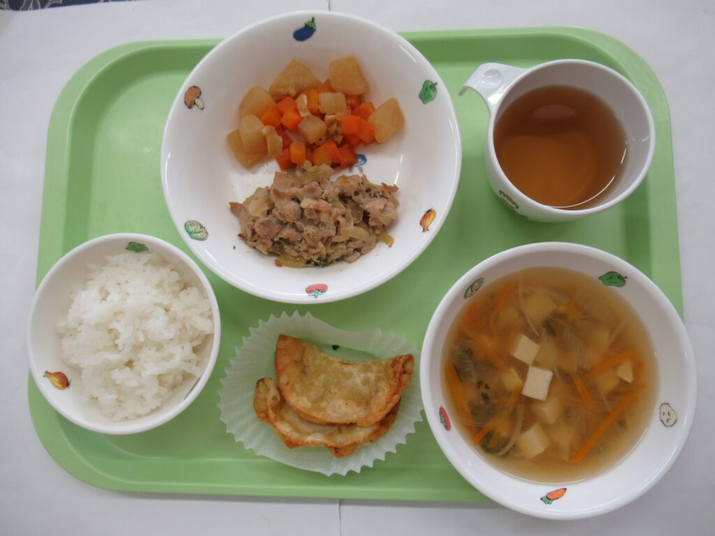 1月19日(金)給食:豚肉のしょうが焼き・大根とあげの煮物・みそ汁 おやつ:かぼちゃパイ風