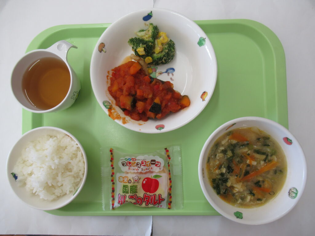 1月23日(金)給食:鶏肉と野菜のトマト煮・ブロッコリーのゴマドレ・みそ汁     おやつ:お米DEタルト