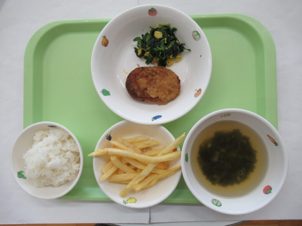 1月5日(月)給食:おろしハンバーグ・ほうれん草のソテー・スープ おやつ:フライドポテト