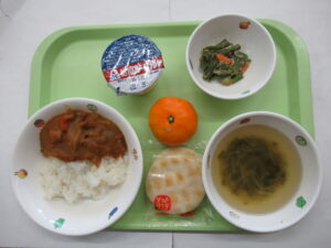 1月8日(水)給食:カレーライス・いんげんのごまドレ・スープ・ ヨーグルト おやつ:みかん・せんべい