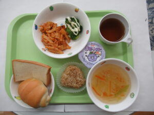 1月9日(木)給食:パン・ラザニア風・ゆでブロッコリー・春雨スープ・ゼリー おやつ:おかかおにぎり
