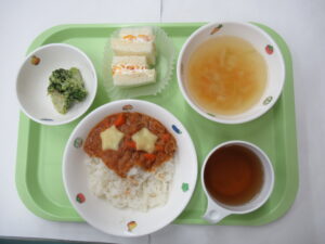 10月15日(水) 給食:ハヤシライス・胡麻ドレブロッコリー・キャベツのスープ おやつ:デコフルーツサンド