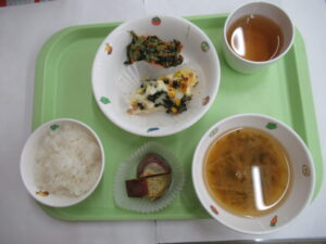 10月29日(水) 給食:魚のマヨ焼き・青菜のごま和え・みそ汁    おやつ:焼きいもNew!!