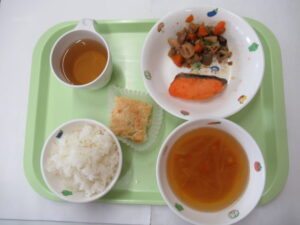 10月7日(火) 給食:焼き鮭・筑前煮・みそ汁 おやつ:しっとりりんごケーキ
