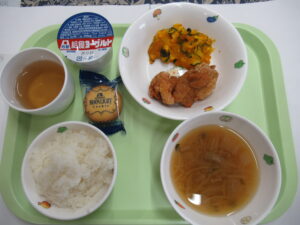 10月8日(水) 給食:鶏肉のおろし和え・かぼちゃサラダ・みそ汁 おやつ:ヨーグルト・クッキー