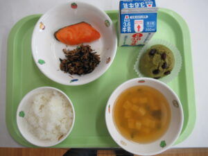 11月14日(金) 給食:さつま芋ごはん・からあげ甘辛あえ・ほうれん草とコーンいため・みそ汁  おやつ:デコレーションクレープNew!!