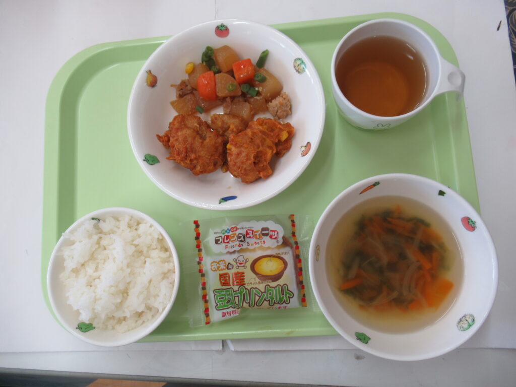 11月17日(月) 給食:納豆のおとし揚げ・鶏肉の大根のコク旨煮・わかめスープ おやつ:お米プリンタルト