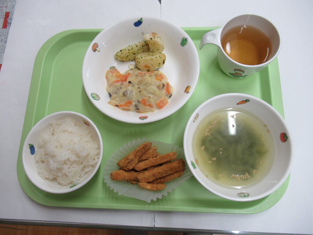 11月4日(火) 給食:チキンのクリーム煮・ベイクドポテト・スープ おやつ:きなこいも