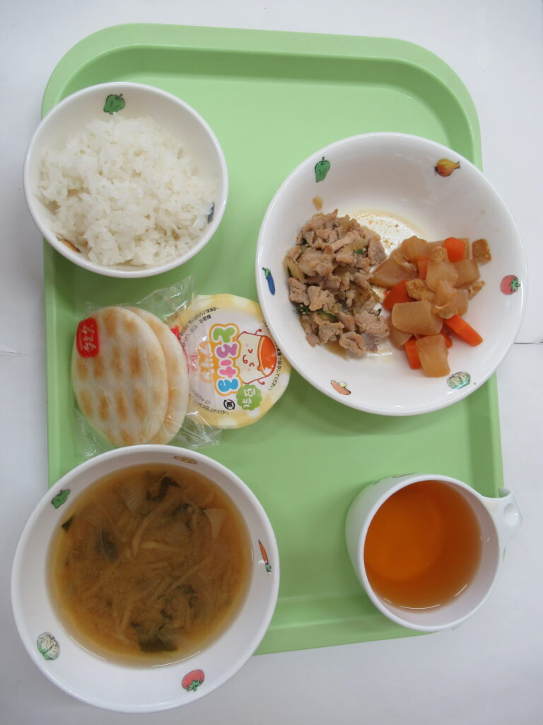 11月7日(金) 給食:豚肉のしょうが焼き・大根とあげの煮物・みそ汁 おやつ:プリン・せんべい