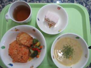 12月23日(火)給食:🎄ケチャップライス☆タンドリーチキン☆クリスマスツリー風サラダ☆コーンクリームスープ🎄           おやつ:クリスマスケーキ⛄New!!