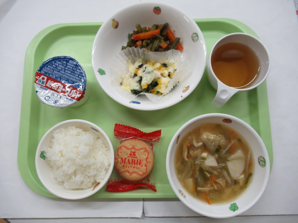 12月24日(水)給食:魚のマヨ焼き・いんげんのおかか煮・みそ汁   おやつ:ヨーグルト・クッキー