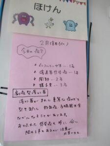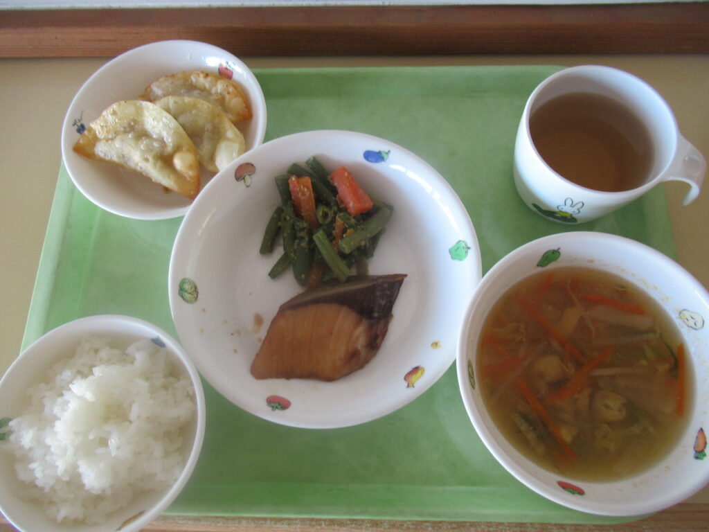 2月18日(水)給食:ぶりの照り焼き・いんげんのごま和え・みそ汁     おやつ:バナナパイ風