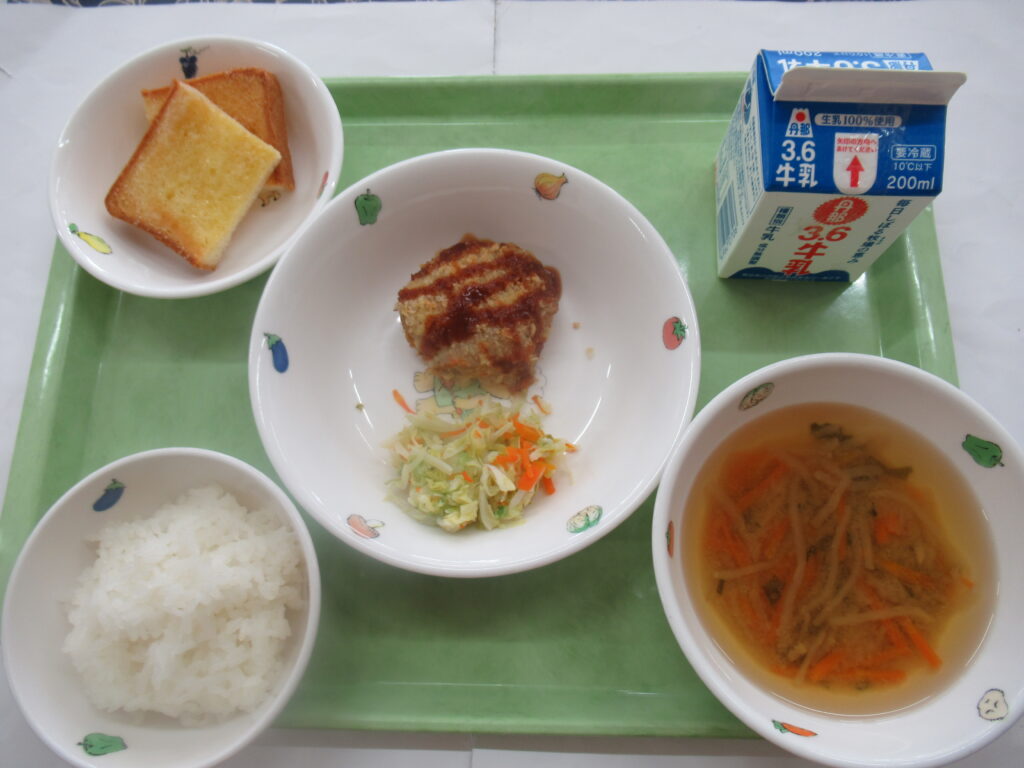 2月20日(金)給食:メンチカツ・ゆで野菜・みそ汁 おやつ:シュガーパン