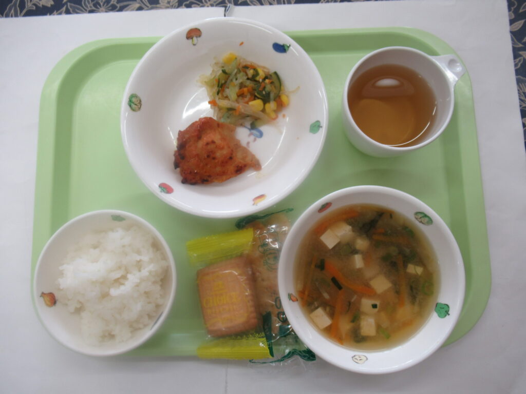 2月5日(木)給食:チキンスパイス焼き・春雨サラダ・みそ汁 おやつ:せんべい・クッキー