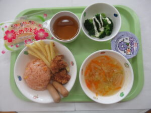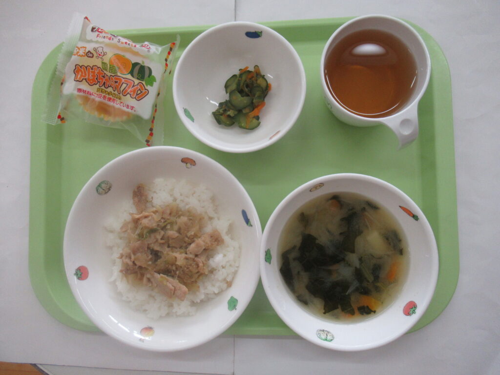 3月26日(木)給食:豚丼・きゅうりの酢の物・みそ汁            おやつ:お米DEかぼちゃマフィン