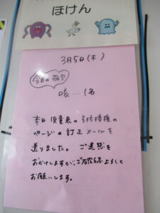 3月5日(木)給食:豚肉のしょうが焼き・にんじんしりしり・みそ汁 おやつ:おやつ焼きそば
