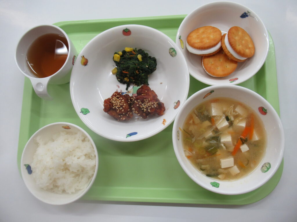4月13日(月)給食:ヤンニョムチキン・ほうれん草のおかか和え・みそ汁 おやつ:リッツサンド