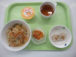 4月14日(月)給食:肉野菜うどん・シュウマイ おやつ:五平餅