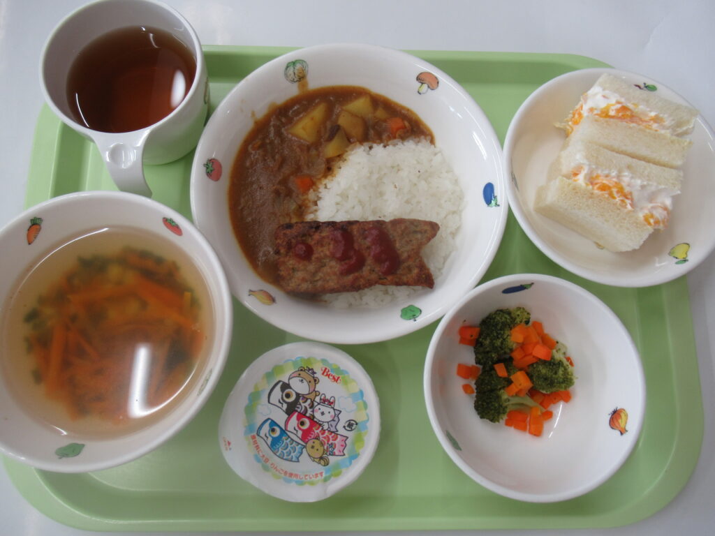 2026年4月24日 / 最終更新日時 : 2026年4月24日 shiinoki-hoikuen 給食 4月24日(金)給食:ハンバーグカレー・ブロッコリーと人参の彩和え・スープ・こどもの日ゼリー おやつ:フルーツサンド