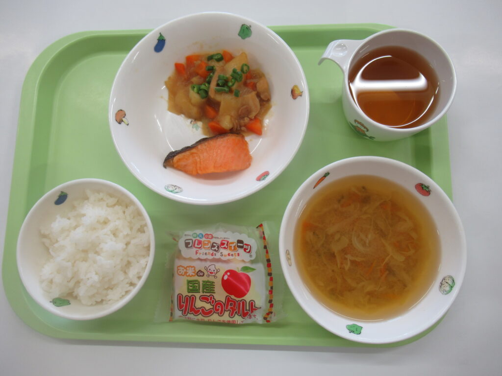 4月8日(火)給食:塩鮭・肉じゃが・みそ汁 おやつ:お米deタルト